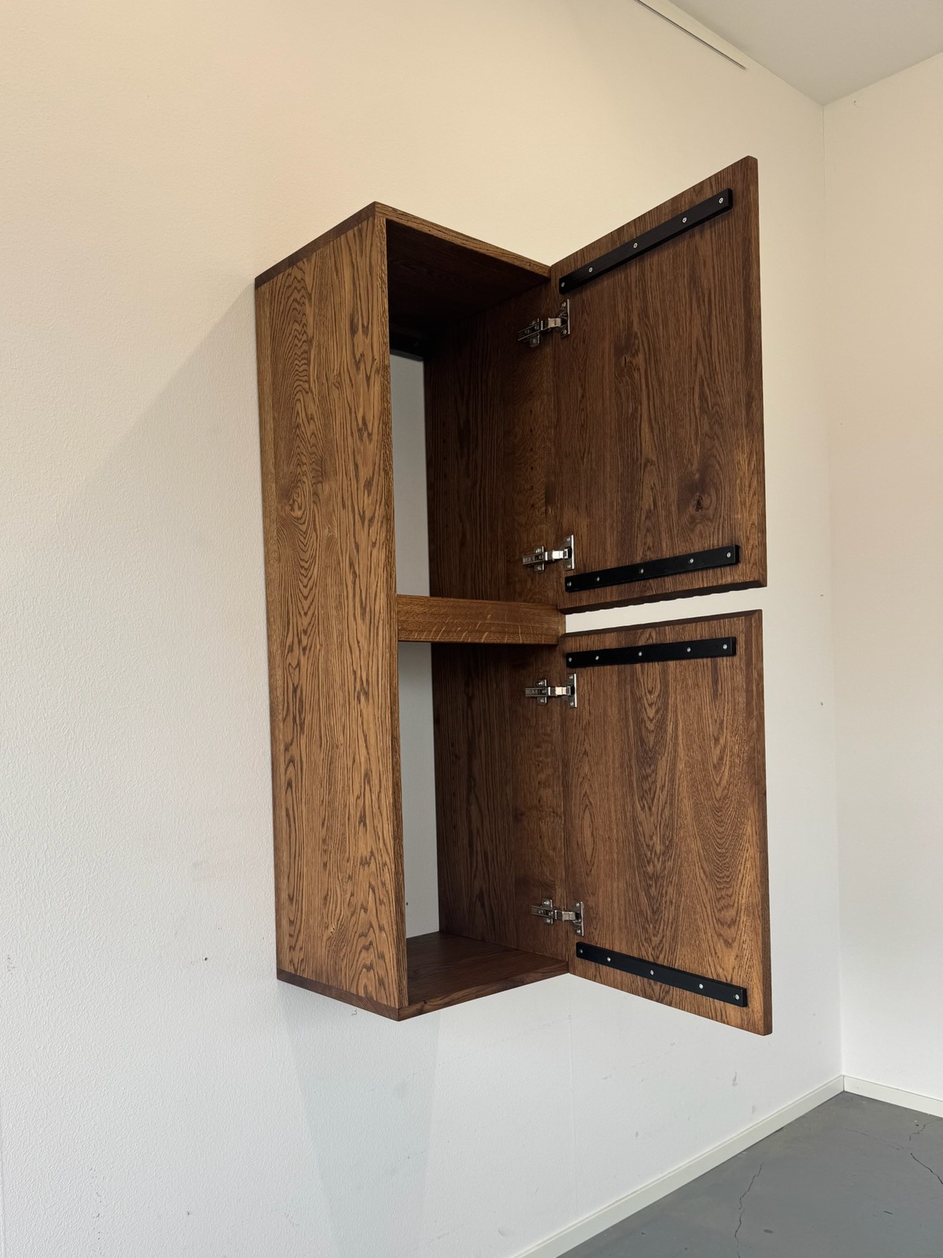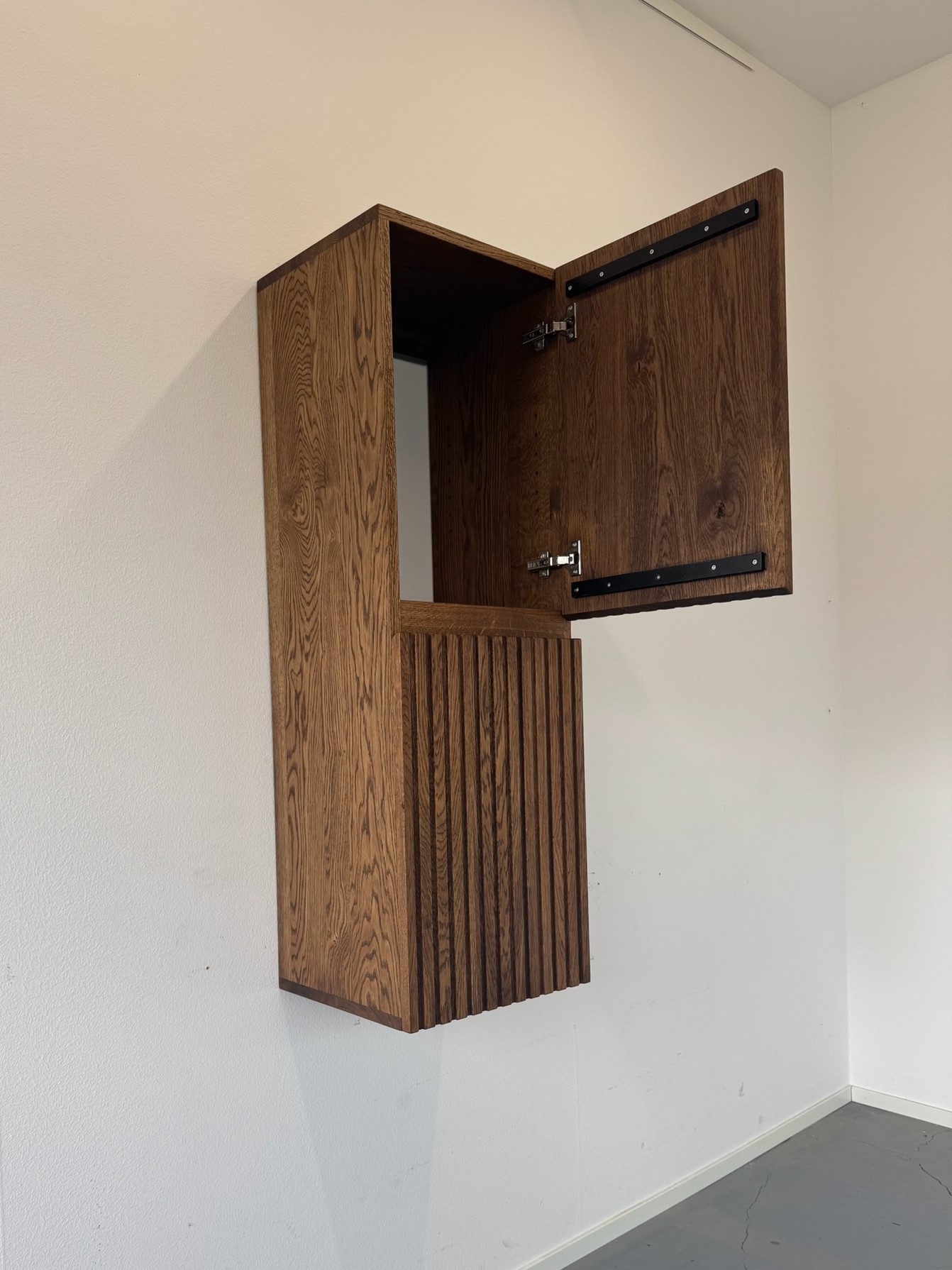 Zwevende badkamerkast met ribbelfront deuren van massief eikenhout | Tilburg