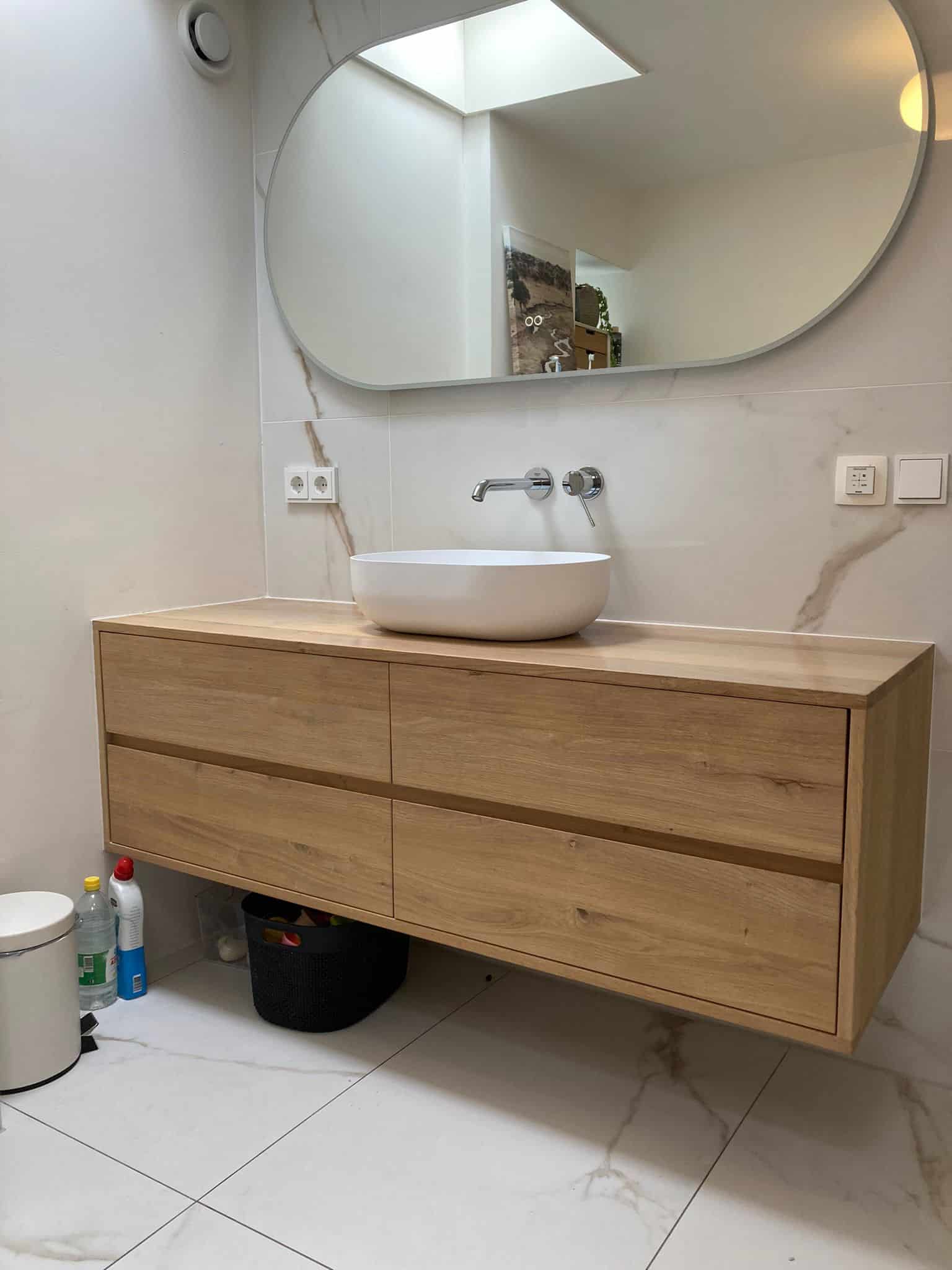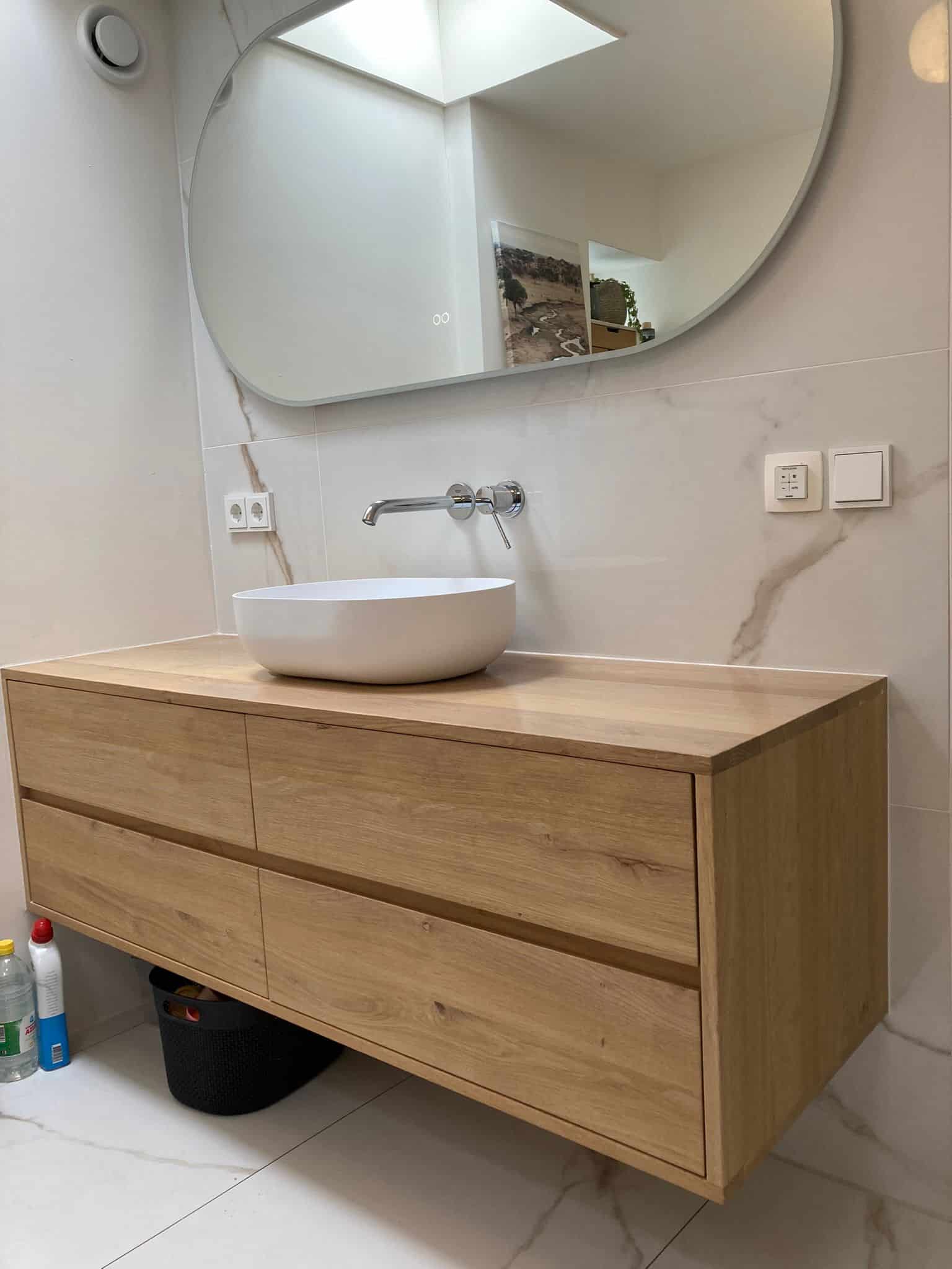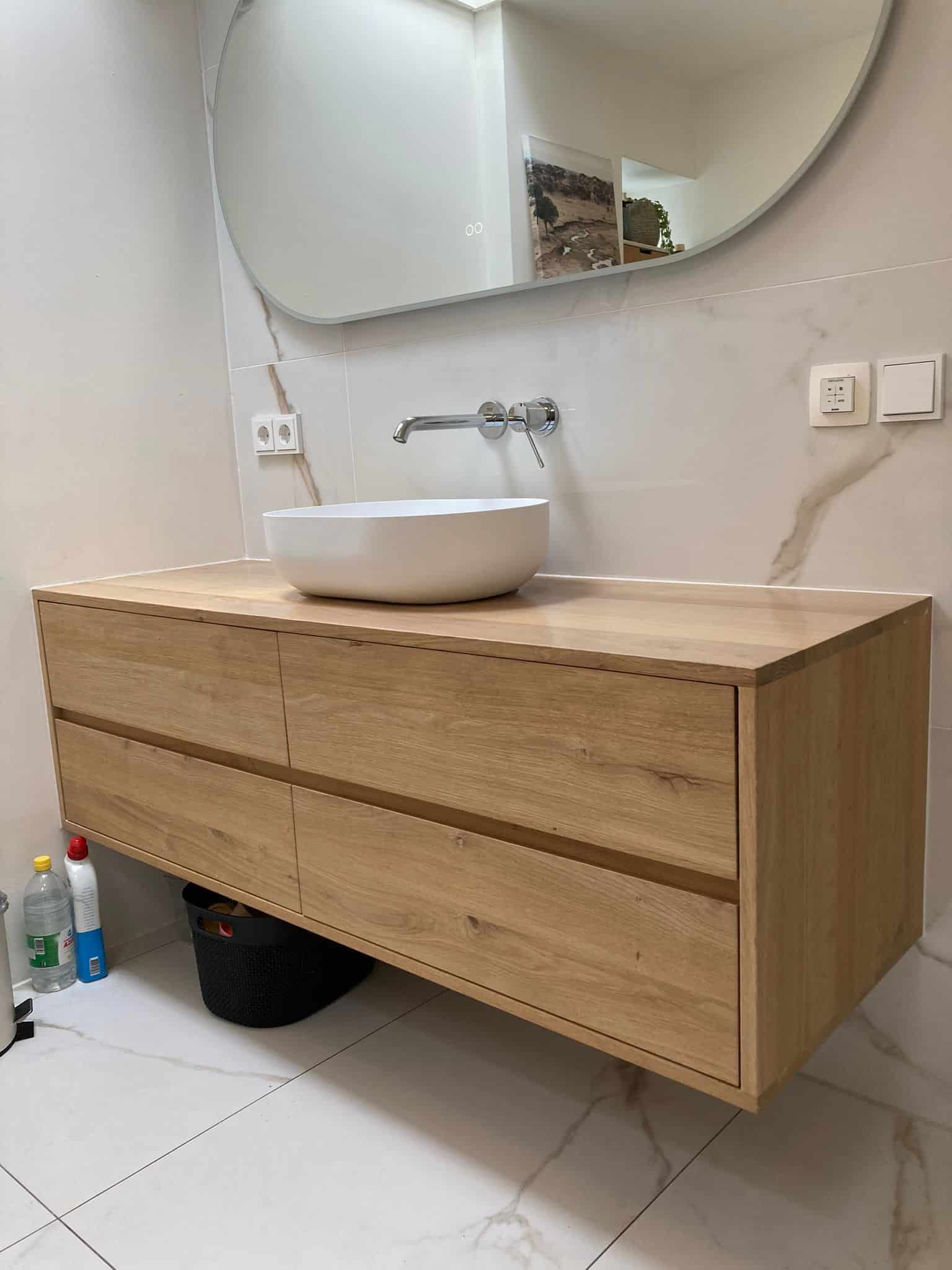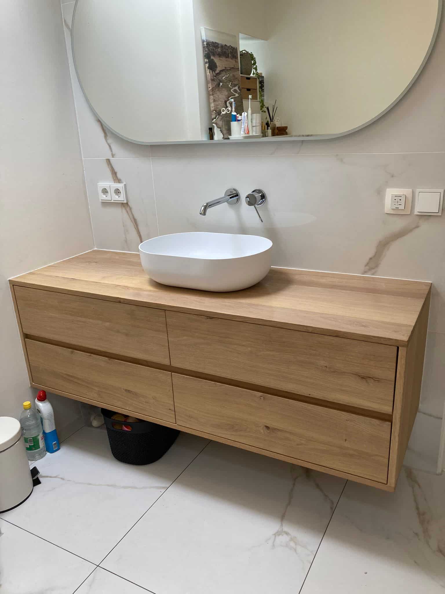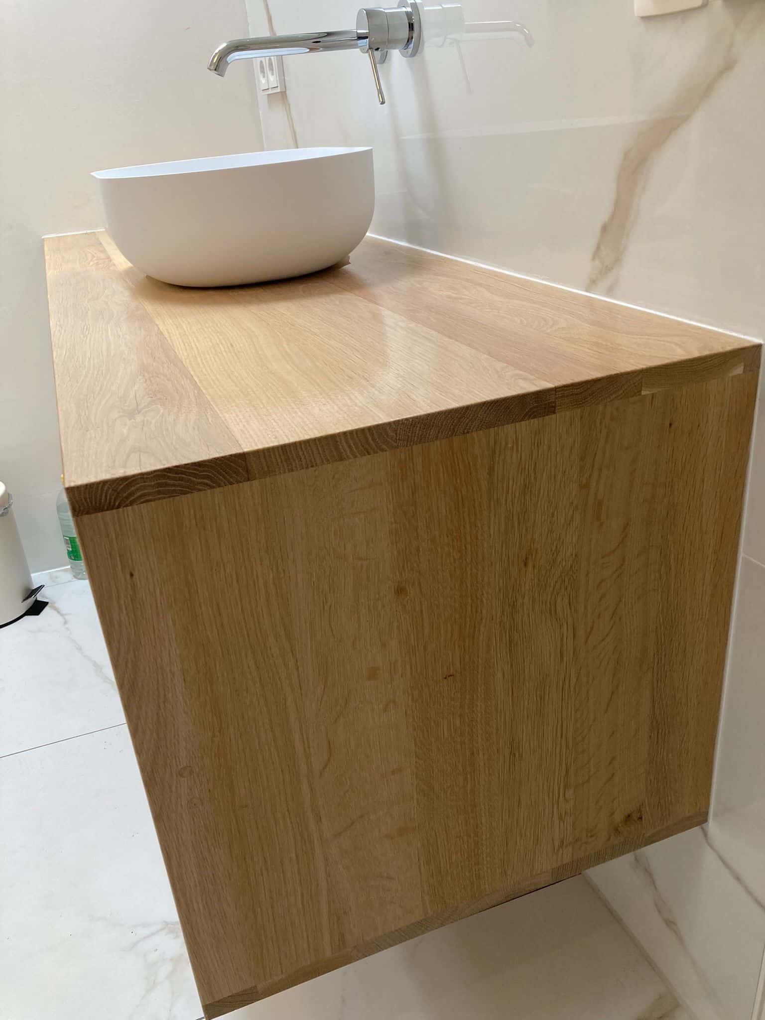 Dit badkamermeubel is gemaakt van 2cm massief rustiek eikenhout. Het meubel wordt standaard behandeld met 2k skylt of een van de 40 verschillende kleuren olie van rubio monocoat. Dit maakt het uitermate geschikt voor in de badkamer en makkelijk schoon te houden. Het meubel kan geleverd worden in verschillende kleuren.