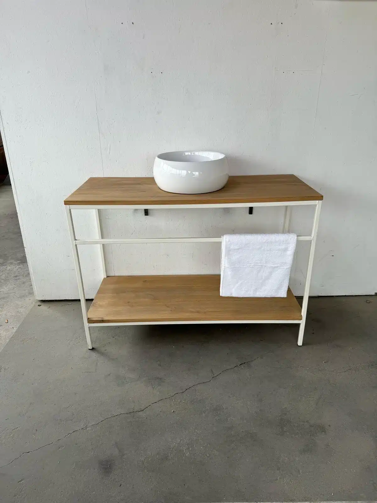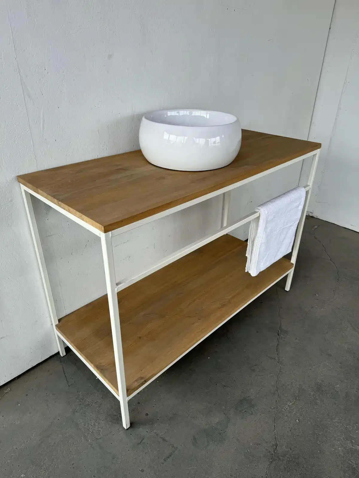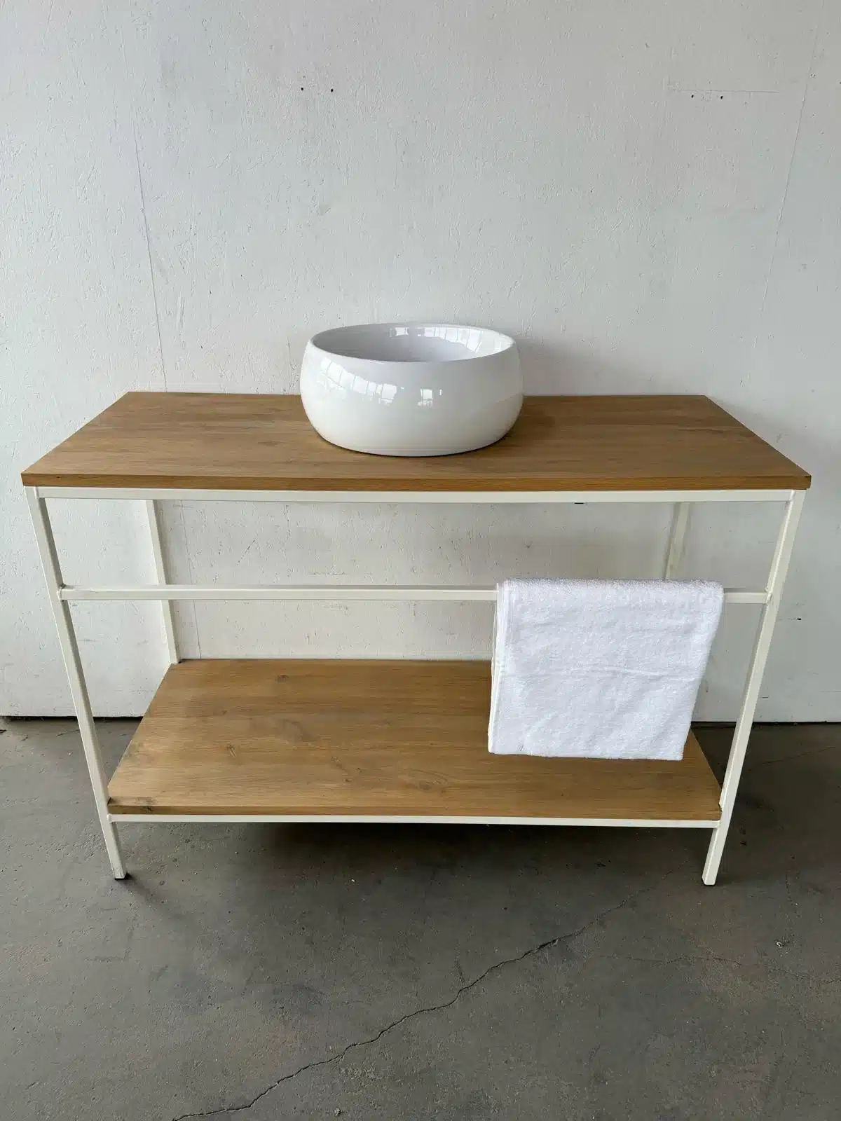 Dit badkamermeubel is gemaakt van 2cm massief rustiek eikenhout. Het meubel wordt standaard behandeld met 2k skylt of een van de 40 verschillende kleuren olie van rubio monocoat. Dit maakt het uitermate geschikt voor in de badkamer en makkelijk schoon te houden. Het meubel kan geleverd worden in verschillende kleuren. Dit meubel is behandeld in de kleur: 2k Skylt en het staal Ral-9010 mat gepoedercoat.