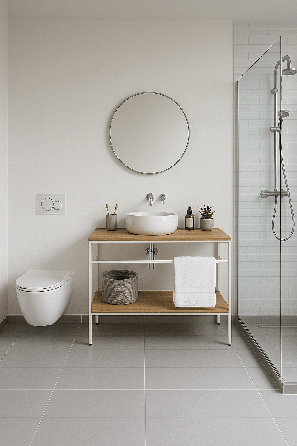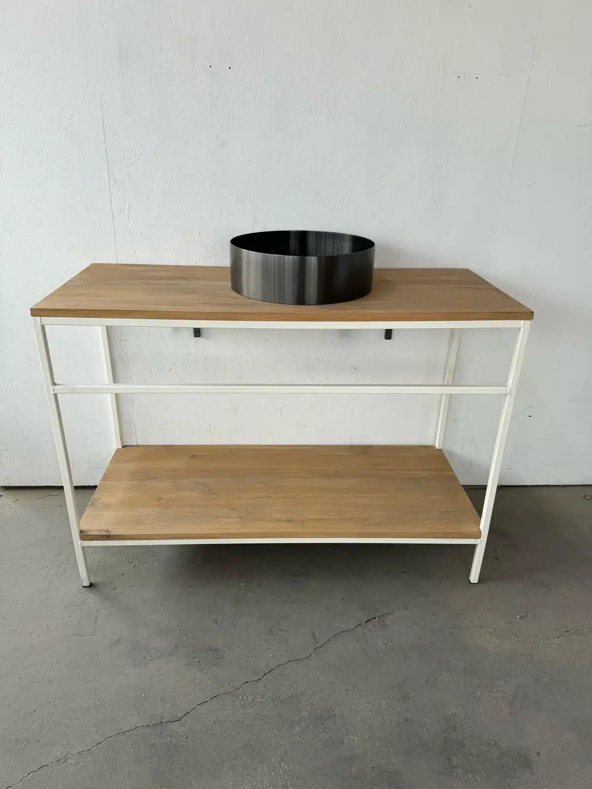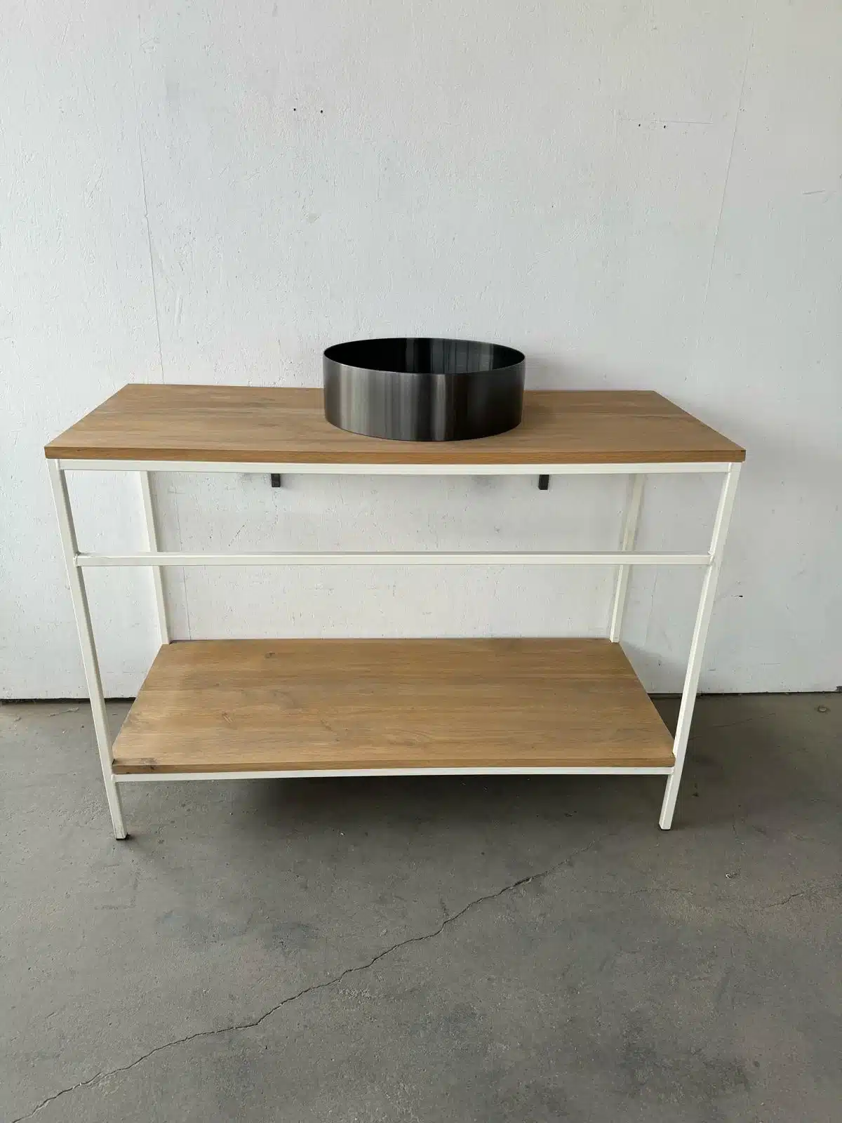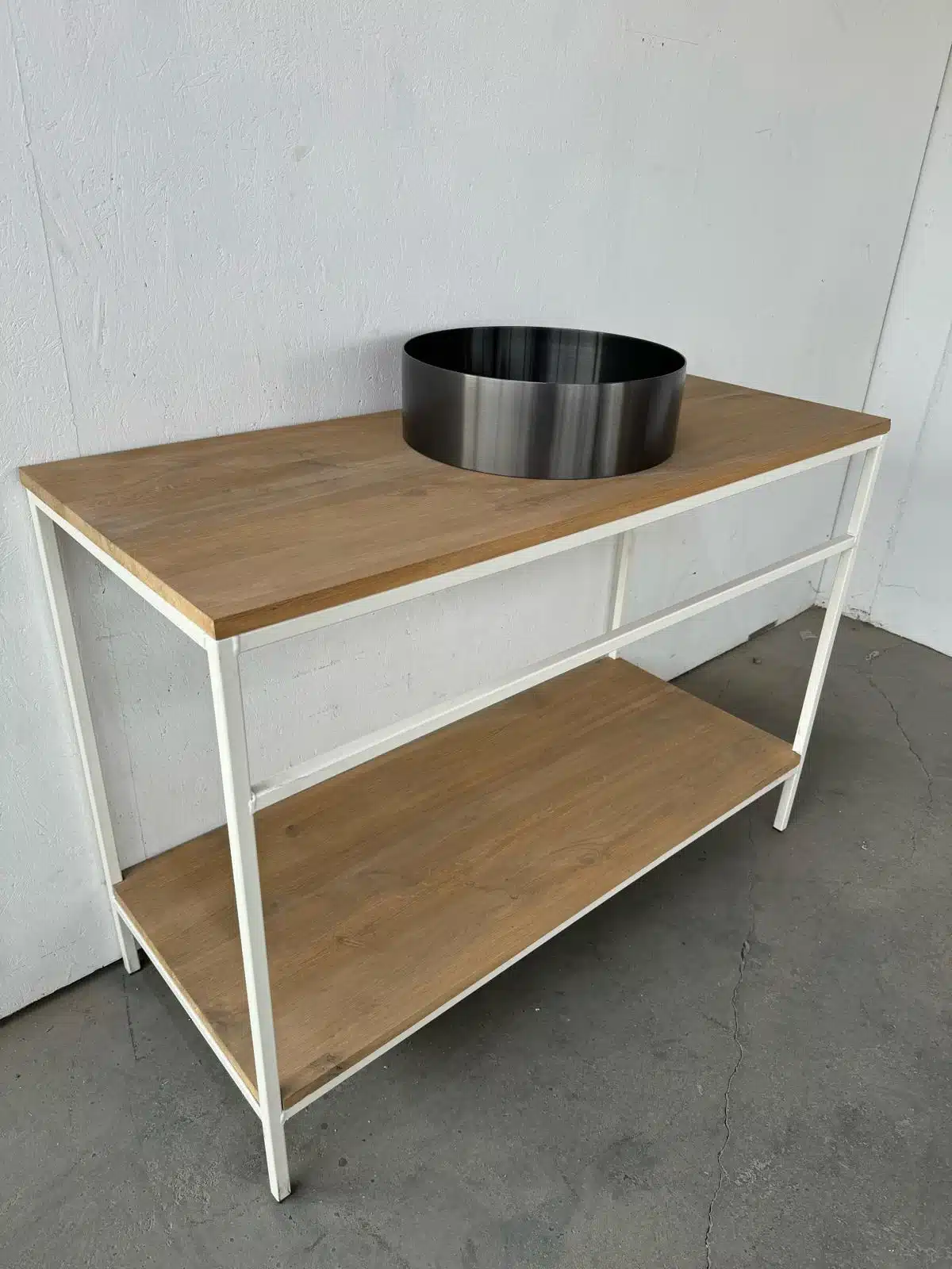 Dit badkamermeubel is gemaakt van 2cm massief rustiek eikenhout. Het meubel wordt standaard behandeld met 2k skylt of een van de 40 verschillende kleuren olie van rubio monocoat. Dit maakt het uitermate geschikt voor in de badkamer en makkelijk schoon te houden. Het meubel kan geleverd worden in verschillende kleuren. Dit meubel is behandeld in de kleur: 2k Skylt en het staal Ral-9010 mat gepoedercoat.
