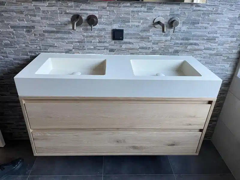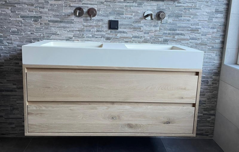 Dit badkamermeubel is gemaakt van 2cm massief rustiek eikenhout. Het meubel wordt standaard behandeld met 2k skylt of een van de 40 verschillende kleuren olie van rubio monocoat. Dit maakt het uitermate geschikt voor in de badkamer en makkelijk schoon te houden. Het meubel kan geleverd worden in verschillende kleuren. Dit meubel is behandeld in de kleur: 2k skylt voor behoud van de eiken kleur.