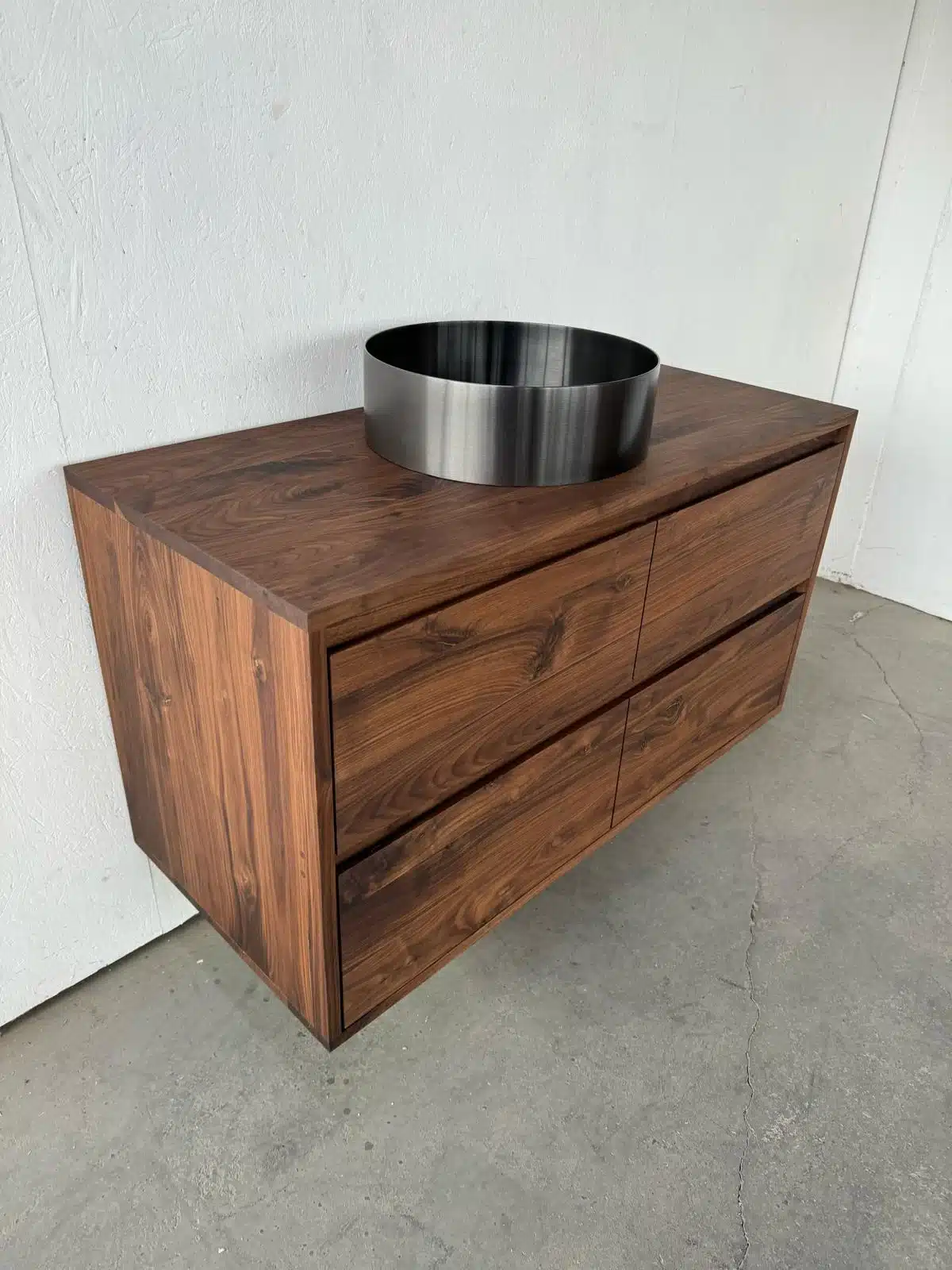 Dit badkamermeubel is gemaakt van massief 2cm dik rustiek notenhout. het meubel is behandeld met een blanke olie die de kleur en houtstructuur er prachtig laat uitkomen.