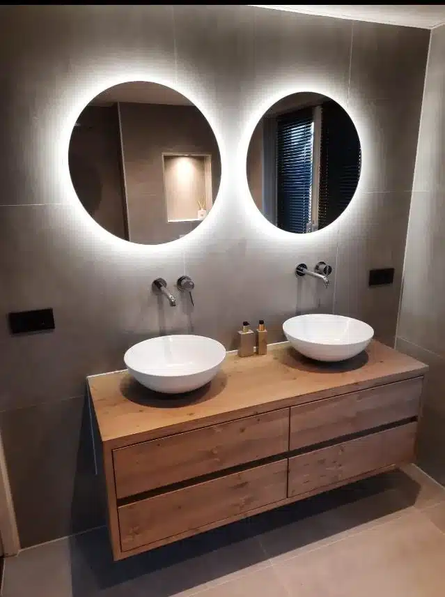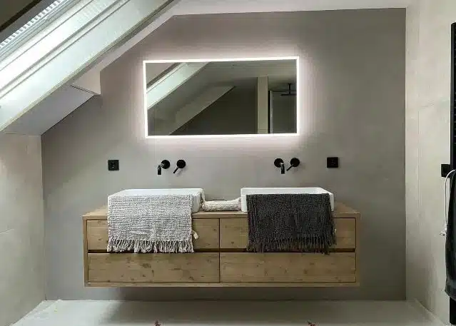 Dit badkamermeubel is gemaakt van geschaafd hout. Het meubel wordt standaard behandeld met drie lagen lak. Dit maakt het uitermate geschikt voor in de badkamer en makkelijk schoon te houden. Het meubel kan geleverd worden in verschillende kleuren. Dit meubel is behandeld in de kleur: cementwash.