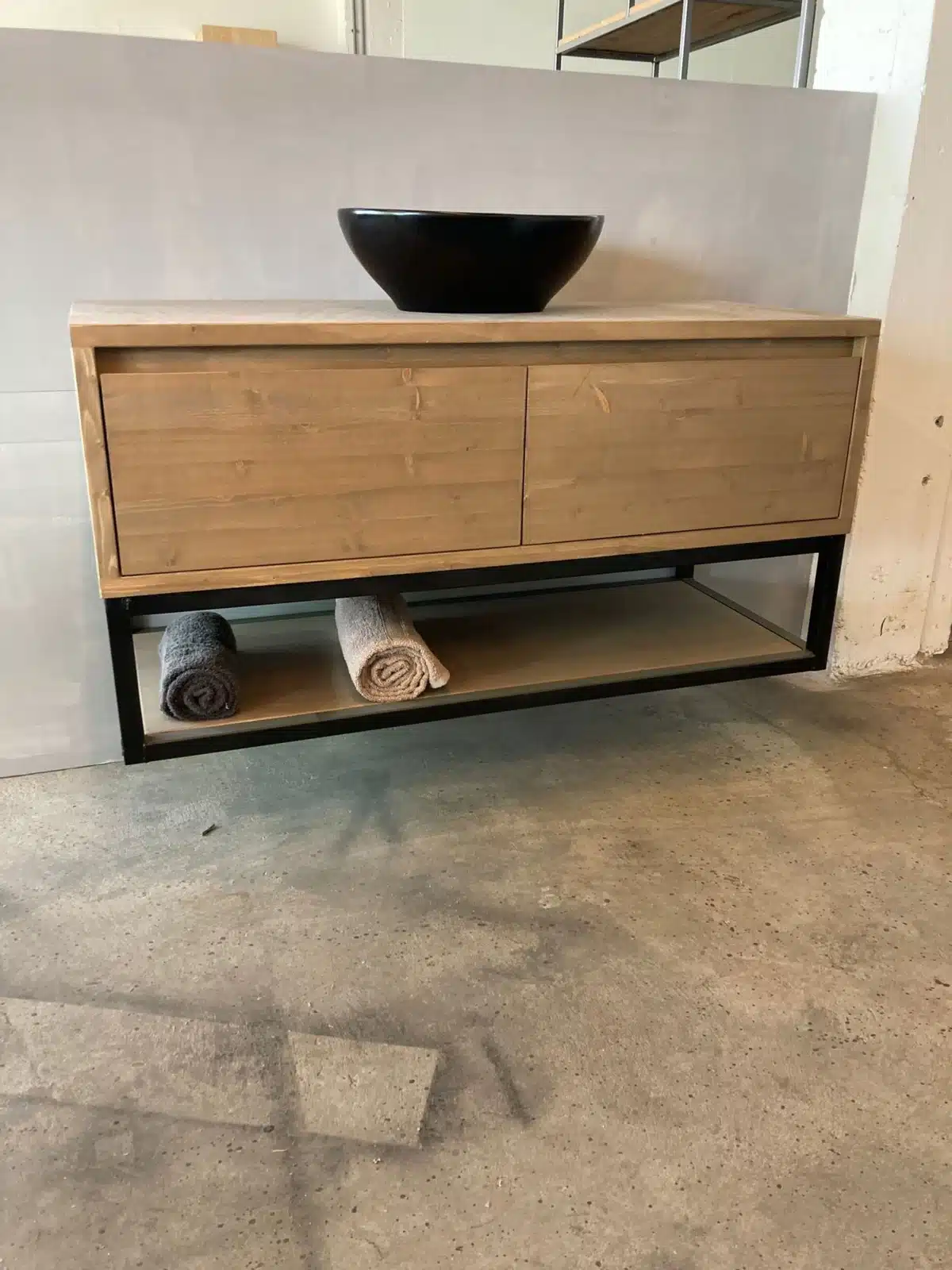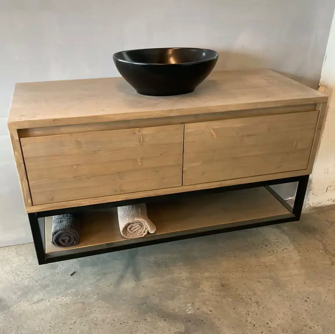 Dit badkamermeubel is gemaakt van geschaafd hout. Het meubel wordt standaard behandeld met drie lagen lak. Dit maakt het uitermate geschikt voor in de badkamer en makkelijk schoon te houden. Het meubel kan geleverd worden in verschillende kleuren. Dit meubel is behandeld in de kleur: oud bruin.