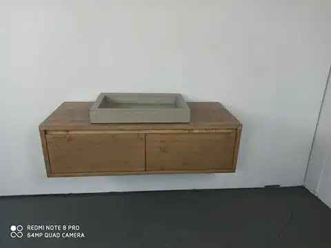 Dit badkamermeubel is gemaakt van geschaafd hout. Het meubel wordt standaard behandeld met drie lagen lak. Dit maakt het uitermate geschikt voor in de badkamer en makkelijk schoon te houden. Het meubel kan geleverd worden in verschillende kleuren. Dit meubel is behandeld in de kleur: oud bruin.