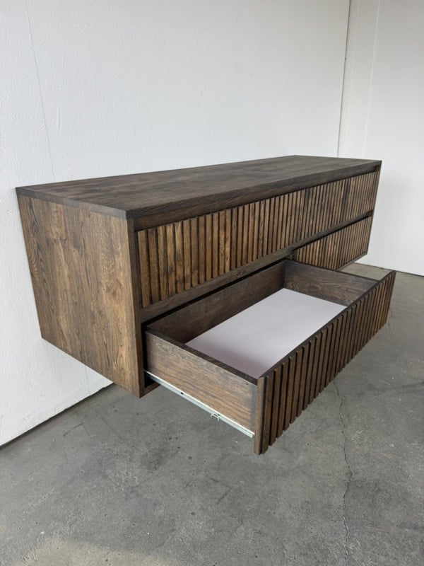 Dit zwevende massief eiken tv meubel is voorzien van 2 softclose lades, het eiken is behandeld met Monocoat charcoal . Het meubel kan in 40 verschillende kleuren monocoat olie geleverd worden of 2k skytlak voor behoud eiken kleur